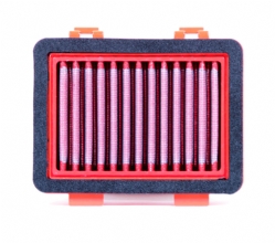 Filtro aire Bmc FM995/04RACE (Versión Race con más entrada de aire). El filtro de aire Bmc Filter FM995/04RACE posee un diseño específico y está diseñado para colocar en sustitución al filtro de aire original. El filtro de potencia Bmc FM995/04RACE de alto rendimiento cuenta con la misma forma que el filtro standard, pero con una base de filtrado mayor incluso que los filtros Bmc standard). Este filtro de carreras reutilizable se caracteriza por su diseño que mejora notablemente la capacidad de aspiración de la toma de aire en comparación con los filtros tradicionales, mejorando también la calidad de la combustión. El filtro de potencia Bmc FM995/04RACE consta de una gasa de algodón de múltiples capas impregnada con aceite de baja viscosidad y recubierta con una malla de aluminio tratado con resina epoxy que garantiza la protección contra los humos del combustible y la oxidación debida a la humedad del aire. Las impurezas se filtran gracias al efecto pantalla y de retención, siendo capturadas por las fibras de algodón y retenidas por el aceite. Este proceso no obstruye la entrada de aire y garantiza el rendimiento constante del filtro de aire a largo plazo. El proceso de filtrado es continuo y los cuerpos extraños quedan depositados en el tejido sin bloquear el flujo de aire. El filtros Bmc está realizado mediante un sistema de “moldeado completo” que permite al característico filtro rojo ser de una sola pieza, sin juntas soldadas, lo cual evita la rotura. La goma que se utiliza en los sistemas de filtrado de aire Bmc es muy resistente y duradera, y posee unas características de adherencia óptimas para adaptarse a todas las formas de las cajas de aire.