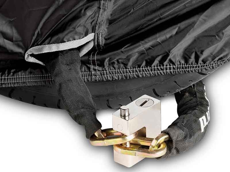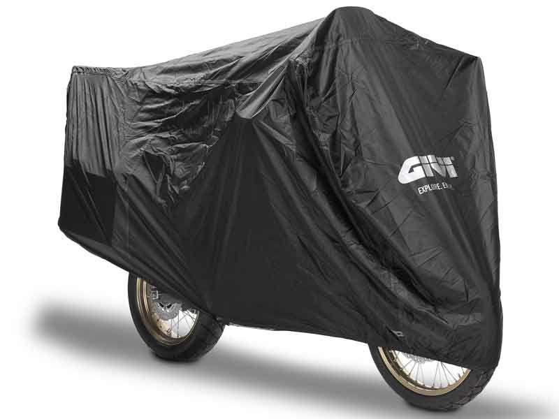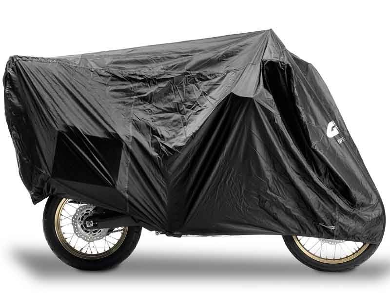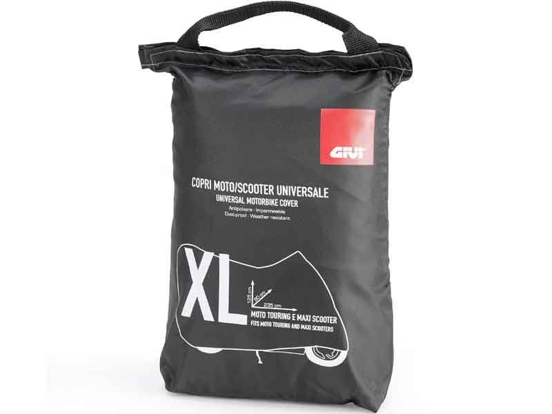 Funda cubremoto Givi S202XL. Se trata de la evolución de la funda S201. La funda protectora Givi S202L está aconsejado para motos grandes; maxiscooter, spor-tourer, tourer, enduro y custom. Realizada en poliéster 210D Oxford de gran calidad y costuras termo-selladas para garantizar impermeabilidad. La funda protectora Givi S202XL dispone de unos agujeros delanteros y traseros para incorporar un antirrobo de cadena través de la rueda. La cinta elástica alrededor de la funda garantiza un ajuste perfecto. Medidas: 238 x 125 x 95 cm.
