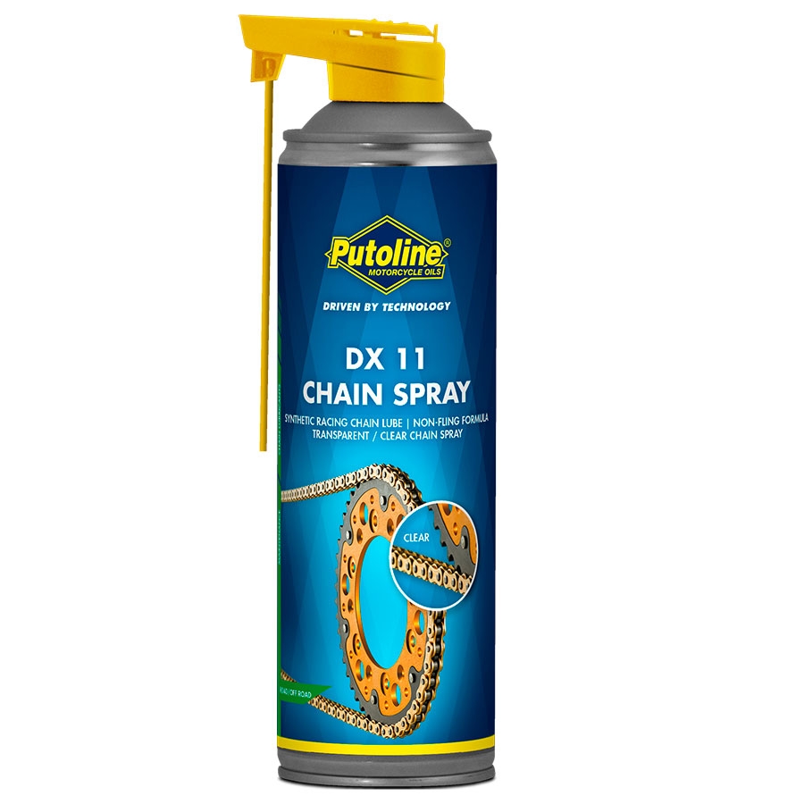 Grasa cadena Putoline DX 11 Chainspray 500 Ml. DX11 Chain Spray es una grasa de cadenas sintética con fórmula exclusiva que deja una capa protectora. Esta grasa de cadena es repelente al agua y penetra en profundidad sobre los eslabones de la cadena. DX11 posee una gran adherencia y resistencia. Proporciona una protección perfecta frente a la corrosión y el desgaste, reduce la fricción y no mancha al utilizarlo. DX 11 Chain Spray es ideal para cadenas abiertas, de junta tórica y de junta en X de motocicletas de carretera y todoterreno de alto rendimiento.