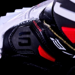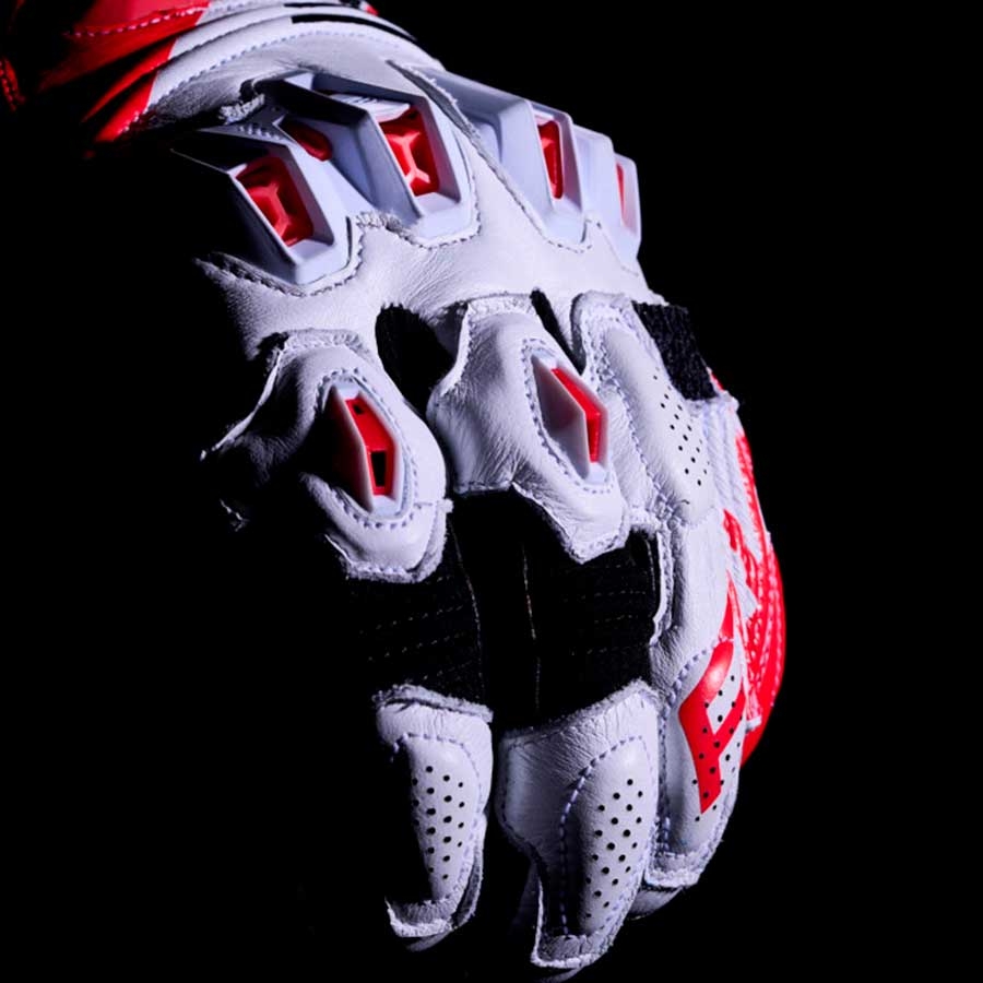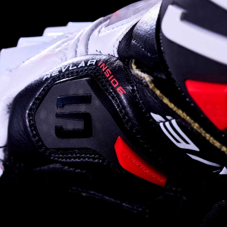 Diseñado para la competición, este guante incorpora las nuevas protecciones AirGO PROTECH™ ventiladas, inspiradas en la tecnología de los cascos: una carcasa exterior rígida combinada con un núcleo interior de estructura alveolar que disipa la energía del impacto y mejora la ventilación. Los metacarpianos están reforzados con un protector de TPU en forma de panal, mientras que la zona del hipotenar integra un complejo sistema multicapa formado por Kevlar®, espuma de 3 mm, SuperFabric® y cuero vacuno flor, culminando con una carcasa deslizante ERGO PROTECH® Performance para proteger en caso de contacto con el asfalto.