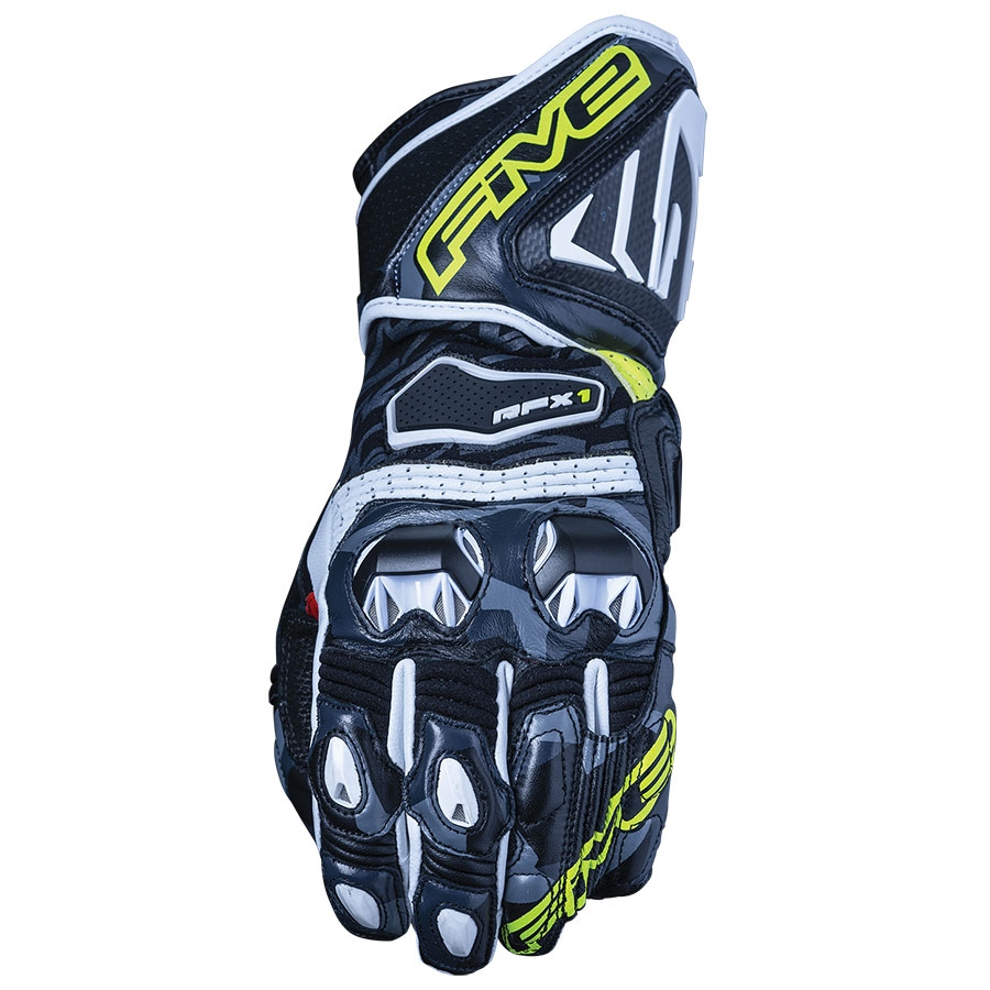 Guantes Five RFX1 Réplica 2020 Camo Amarillo Fluor. Se trata de la última evolución de los guantes racing por excelencia. Los nuevos guantes Five RFX1 V2 incorporan una nueva construcción de Kevlar elástico y piel (en vez de sólo piel) en el pulgar, para un confort superior. Diseñados para un uso deportivo, los RFX1 V2 ofrecen altos niveles de protección con un tacto excepcional y prácticamente único en el mercado. Destacan lo sorprendentemente ligeros que son, con tan sólo 170 gramos. Disponen de protecciones de nudillos en PU y una gran protección en carbono para proteger el antebrazo además de forro interior de Kevlar para mayor resistencia a la abrasión.