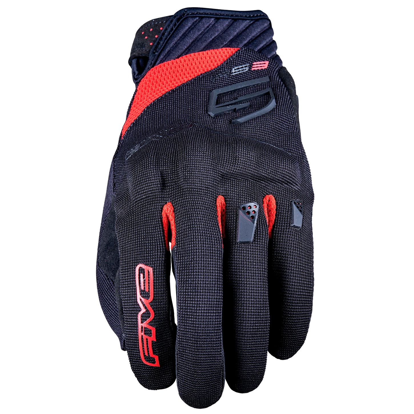Guantes Five RS3 Evo Negro / Rojo (colección 2022). RS3 Evo son los nuevos guantes cortos de verano de Five evolucionados a partir de los RS3, el modelo más vendidos del fabricante Francés. Estos guantes de precio asequible, presentan un nuevo diseño más polivalente y funcional que te permitirá circular cómodamente por la ciudad durante todo el día. Confeccionados en tejido Spandex de 4 vías, los guantes Five RS3 Evo incorporan las nuevas protecciones ErgoProtech, más ergonómicas y seguras que las protecciones anteriores.
