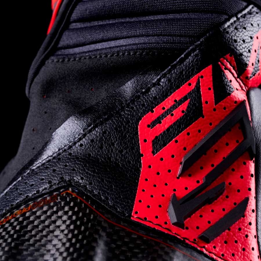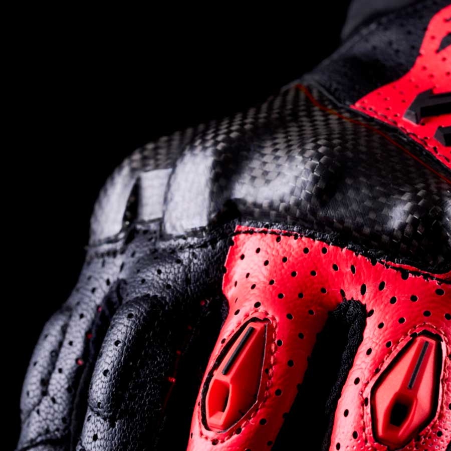 El elemento protagonista del RS-C EVO es su carcasa protectora ERGO PROTECH® de una sola pieza en carbono, que cubre los nudillos y metacarpianos con un diseño ligero y de alto rendimiento. Además, incorpora una deslizadera de palma ERGO PROTECH® de TPR suave que mejora la protección en caso de caída o contacto con el asfalto.