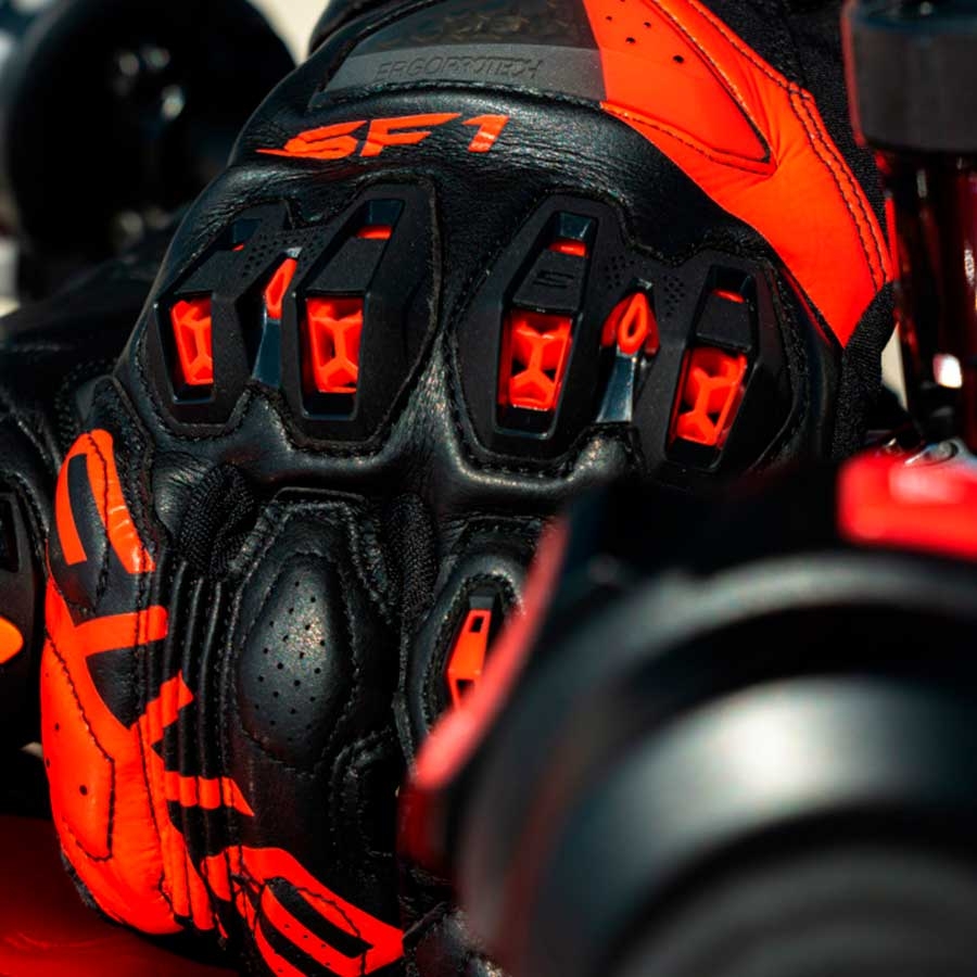 Desarrollado para quienes buscan sensibilidad, precisión y protección en conducción deportiva, el SF1 EVO combina una construcción superior en Syntech Skin™ —material más resistente a la abrasión y tracción que el cuero natural— con una palma de piel de cabra flor ultraflexible, que ofrece un tacto directo y seguro sobre los mandos.