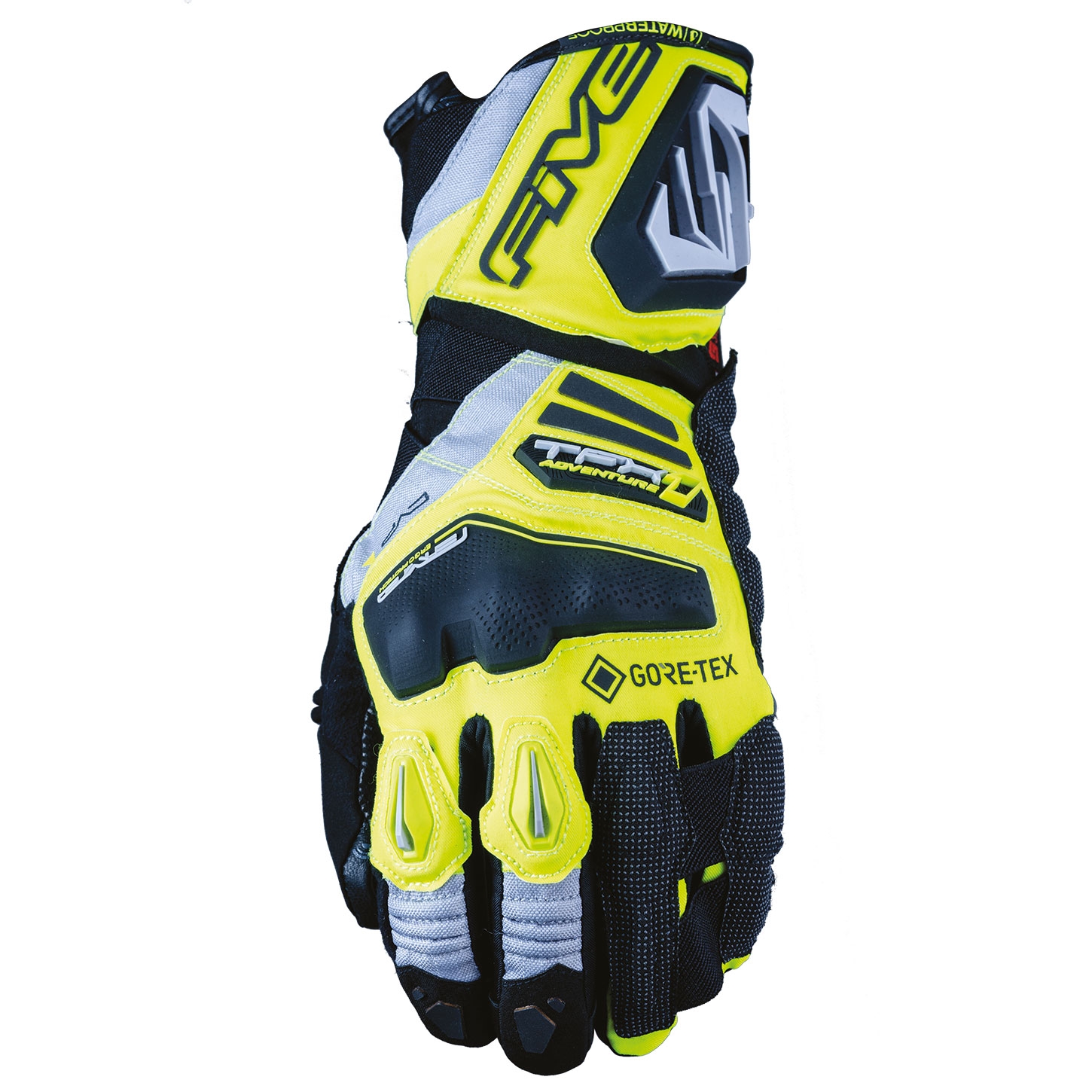 Guantes Five Tfx1 Gtx Gris / Amarillo Fluor (colección 2021-2022). Los nuevos guante de moto Five TFX1 GTX están fabricados con materiales de la más alta calidad y diseñados para devorar miles de kilómetros con la máxima comodidad, protección y durabilidad. La zona superior está confeccionada con una tela elástica repelente al agua y tejido RipStop que en combinación con la piel de cabra en la palma, proporcionan unos niveles extraordinarios de confort y resistencia, fundamentales en viajes de larga distancia. Como no podía ser de otra manera en unos guantes premium, los TFX1 GTX incorporan la membrana Gore-Tex (transpirable y resistente a la intemperie) laminada al revestimiento de la palma y zonas de piel para mantenerte protegido del mal tiempo y al mismo tiempo garantizar el mayor tacto con los puños de la moto. Los guantes Five TFX1 GTX poseen todo lo necesario en términos de seguridad, pero sin restricciones cuando pilotamos.