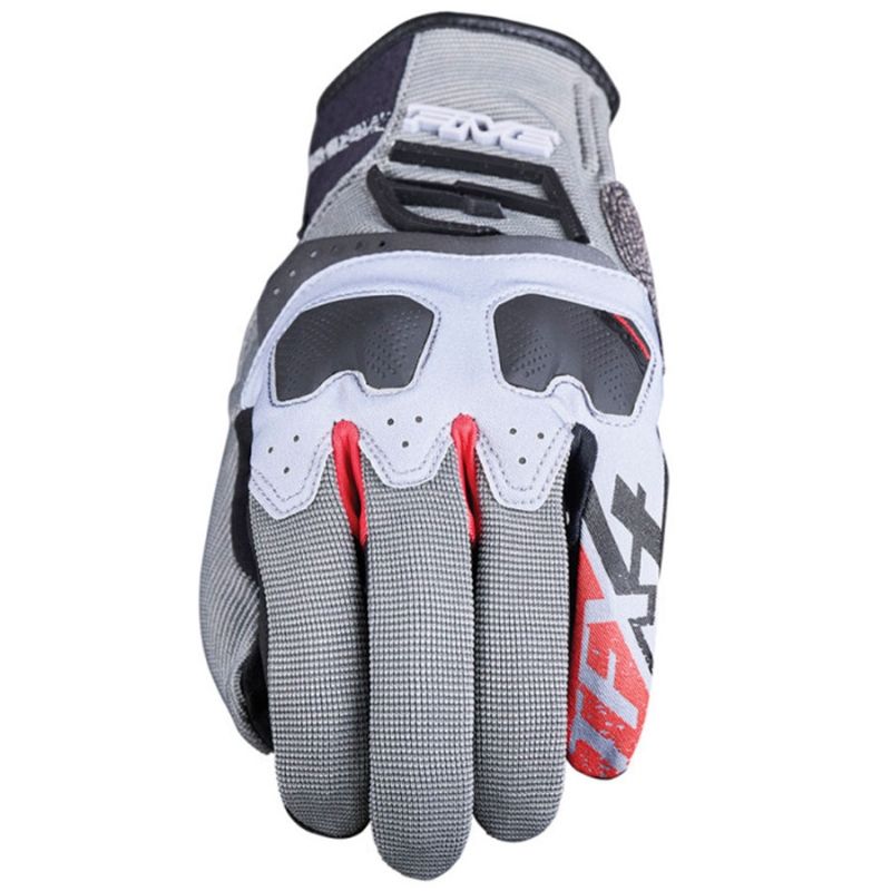 Guantes Five Tfx4 Gris / Rojo. Los nuevos TFX4 son los guantes más económicos de la gama Five Trail-Adventure y que sin duda destacan por ofrecer ligereza, confort y elegancia. Han sido diseñados para ofrecer un excelente rendimiento tanto en conducción por carretera como uso en pistas. Los guantes Five TFX4 han sido confeccionados con un combinación de tejidos repelentes al agua y Spandex de 4 vías en la zona del dorso para mayor una libertad de movimientos, lo que por supuesto se traduce en una mayor precisión sobre los mandos de la moto. Incorporan un doble protector de nudillos ErgoProtech y un amplio panel de Kevlar que tapa practicamente hasta la mitad de la palma. También dispone de impresiones de silicona en los dedos índice y medio para proporcionar un agarre superior con los puños en condiciones de humedad. Es importante mencionar, que los guantes Five TFX4 no utilizan en su confección ningún elemento de origen animal.