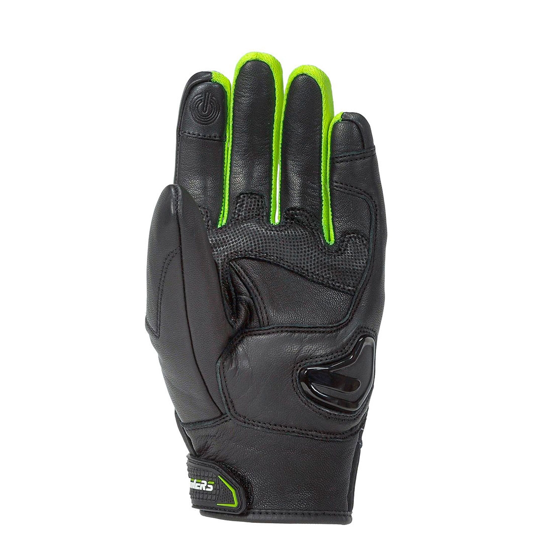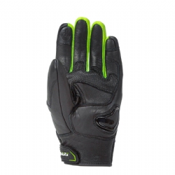 Guantes Rainers Neon Negro / Amarillo Fluor. Guante de verano corto, ligero y confortable con look racing, ideal para desplazamientos urbanos. Palma confeccionada en piel y dorso en piel y poliéster, cuentan con protección en los nudillos y deslizadera en la palma en TPU.