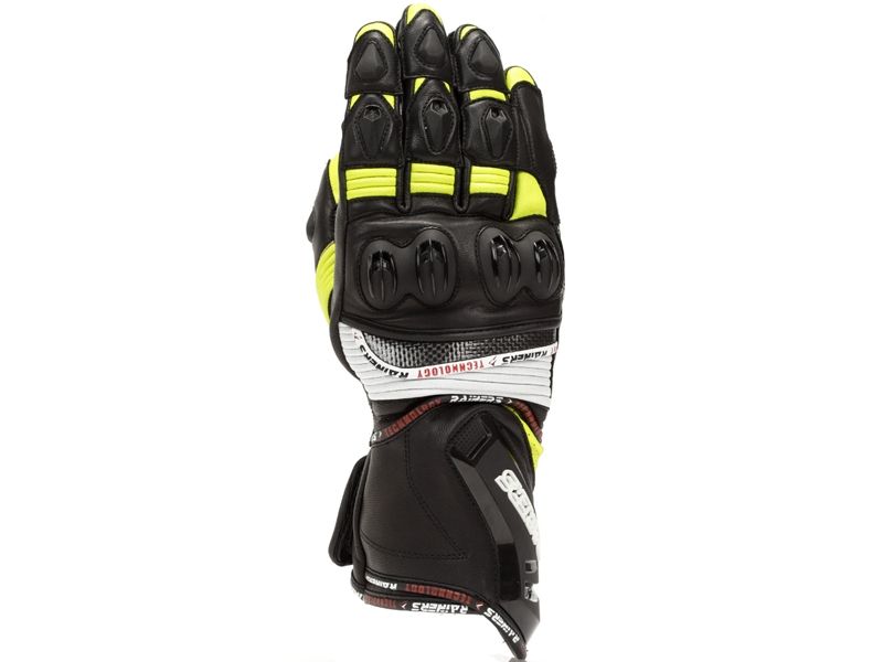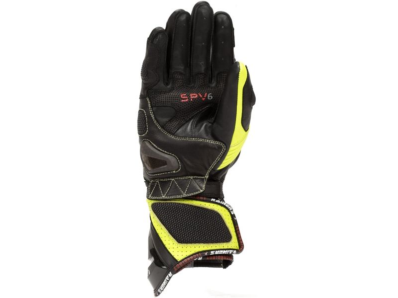 Guante Rainers SPV6 Amarillo Fluor. Los guantes Rainers SPV6 destacan por ofrecer protecciones de alto nivel con un tacto excelente y un precio muy reducido. El SPV6 de Rainers esta confeccionado en suave piel de cabra para garantizar el mejor confort. A nivel de protección, este guantes racing ofrece numerosos detalles como el protector de nudillos y muñeca, ambos realizados en TPU altamente resistente. Para resistir a la abrasión, el forro interior está confeccionado en Kevlar además del coolmax que mejora notablemente la sensación de confort. Protector de tejido de alta resistencia (Superfabric) ubicado en zonas estratégicas, costuras externas de Kevlar, cierre con doble velcro son algunas de las características de los guantes Rainers SPV6.