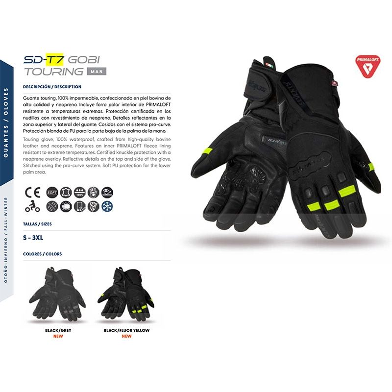 - Los guantes Seventy Degrees Gobi SD-T7 Touring incluyen detalles reflectantes estratégicamente situados para mejorar la visibilidad del conductor en condiciones de poca luz.