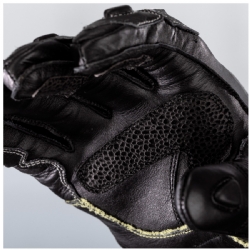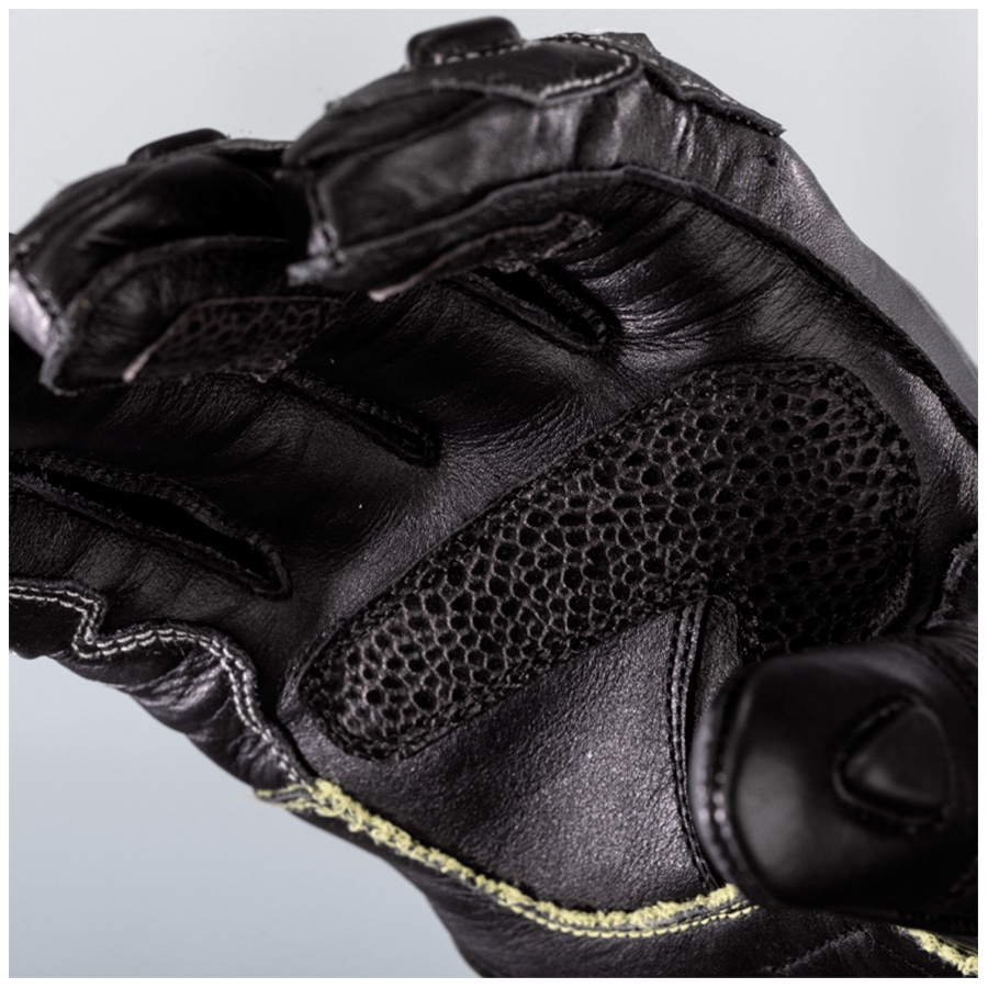 Están confeccionados en una combinación premium de cuero de canguro y cuero de vaca plena flor, con costuras y refuerzos en fibra de aramida en zonas críticas. Montan protector de nudillos en carbono con homologación CE Nivel 1 (KP), y refuerzos de seguridad típicos de guante racing: deslizador de palma RST, doble capa de piel en la palma, puente elástico en el meñique y protección en pulgar con espuma viscoelástica.