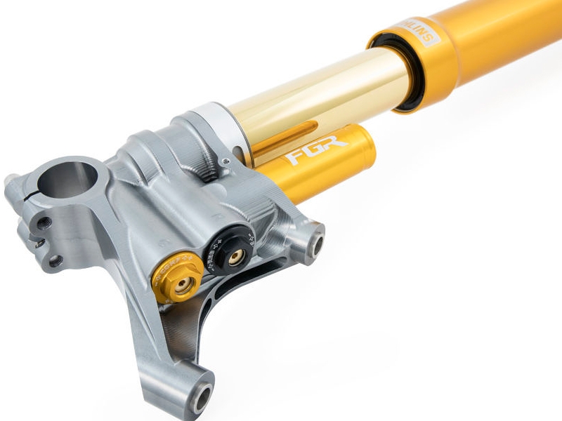 Horquilla Ohlins FGR 301 Superbike. La horquilla delantera universal Ohlins FGR FGR 301 incorpora soluciones técnicas desarrolladas en MotoGP y World Superbike. La horquilla FGR 300 ofrece prestaciones superiores que su predecesora para mantenerse por delante sus competidores más directos. Basándose en la tecnología del kit de cartuchos de horquilla delantera presurizada TTX25, la botella reforzada agrega rigidez al diseño, crucial para un control completo en competición, y un vástago de pistón más delgado que permite un comportamiento dinámico mejorado. Además, una válvula de 3.5 mm permite un rango de regulación mayor, regulaciones que nunca han sido más fáciles de realizar con las perillas de ajuste codificadas por color para compresión y extensión, junto con una función de regulación por clics para la precarga del muelle.