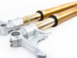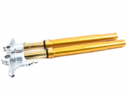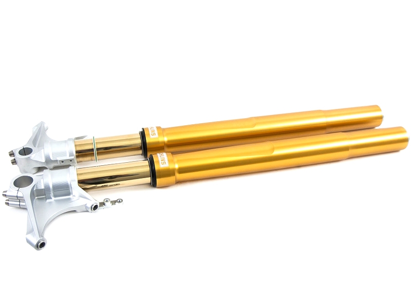 Horquilla Ohlins FGRT 231 Ducati Panigale (horquilla showa) Gold. La horquilla delantera Ohlins FGRT FGRT 231 incorpora tecnología que deriva de la experiencia adquirida en competición con los kits de cartuchos de horquilla delantera de 30 mm. La FGRT 200 dispone de un sistema hidráulico de compresión y extensión totalmente separados, con la compresión en una barra y la otra de extensión. Este sistema garantiza un comportamiento más dinámico, además de que permite un mejor acceso a la regulación hidráulica en la parte superior de cada barra. La nueva horquilla delantera mejora las sensaciones del piloto, la frenada y el control de la moto en general. La horquilla Ohlins GRT 200 posee un diseño perfecto en términos de rendimiento y apariencia.