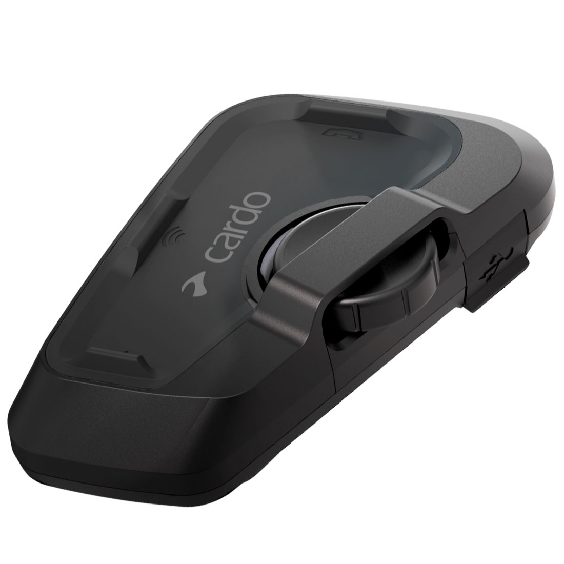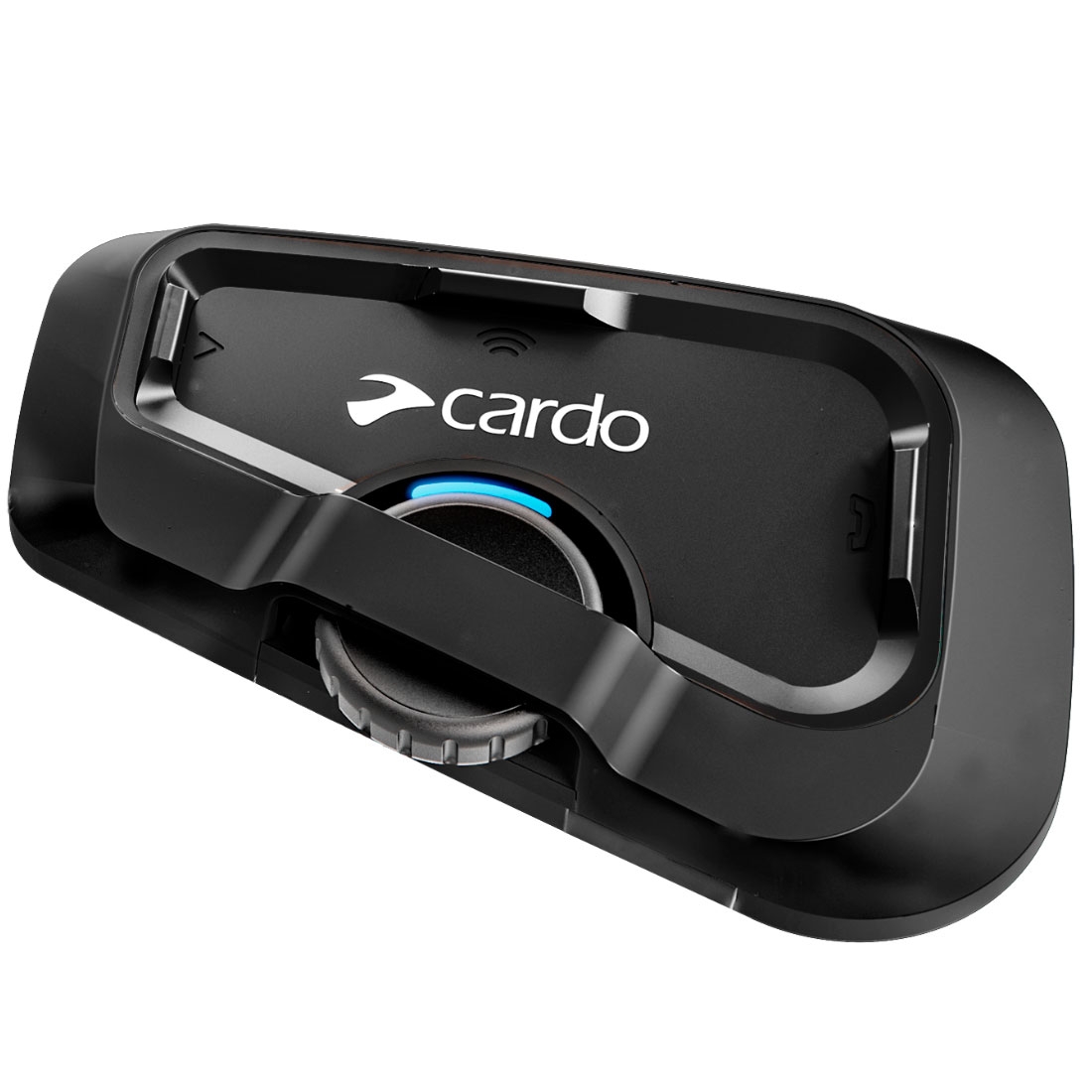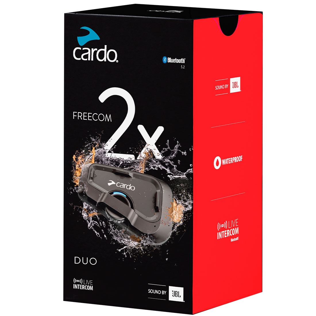 Intercomunicador Cardo Freecom 2X Duo FRC2X103. Cardo Systems renueva toda su gama en el 2022, mejorando los ya exitosos Frecom+. El nuevo intercomunicador Freecom Cardo Frecom 2X hereda y mejora las características de su antecesor, ampliando la distancia moto a moto hasta 800m, incluyendo en su kit de audio los altavoces JBL de 40mm y el sistema de control de volumen y navegación de menús mediante el timón de control analógico, que nos permite manipularlo con un solo dedo de manera intuitiva, incluso con los guantes puestos. El intercomunicador Freecom Cardo Freecom 2X puede ser usado como intercomunicador piloto-pasajero y moto a moto (800 metros), manos libres, reproductor de música a través del smathphone, escuchar indicaciones del GPS y además cuenta con radio FM con RDS. La nueva opción de carga rápida nos ofrece hasta 2h de autonomía con solo 20m minutos de carga, y 13h con carga completa. Todas estas características hacen del Freecom 2x la mejor opción calidad/precio del mercado para usuarios que buscan un intercom para comunicarse con su pasajero u otra moto. Se puede adquirir el equipo de forma individual o dos unidades pre-emparejadas de fábrica mediante el pack de intercomunicadores Cardo Freecom 2X Duo.