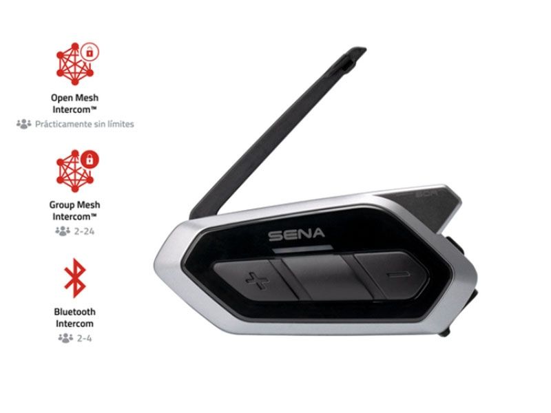El intercomunicador Sena 50R te permite hasta 3 maneras distintas de conexión (Group Mesh Intercom, Multi-Channel Open Mesh Intercom y Bluetooth Intercom). Con la conexión Group Mesh podrás formar un grupo privado de hasta 24 motoristas en un radio de 8 km (mínimo 6 motoristas en intervalos de 1,6 km). Con la conexión Multi-Channel Open Mesh podrás comunicartes con cada motorista de Mesh 2.0 en un radio de 8 km. Además, con el nuevo modo multicanal podrás sintonizar hasta 9 frecuencias distintas y conversar con varios grupos de motoristas dentro del Group Mesh más amplio. Por último, la conexión Bluetooth completa la lista de opciones de intercomunicación. Las diversas configuraciones junto con la versatilidad de la tecnología Mesh 2.0 convierten al Sena 50R en el intercomunicador ideal para afrontar cualquier situación.