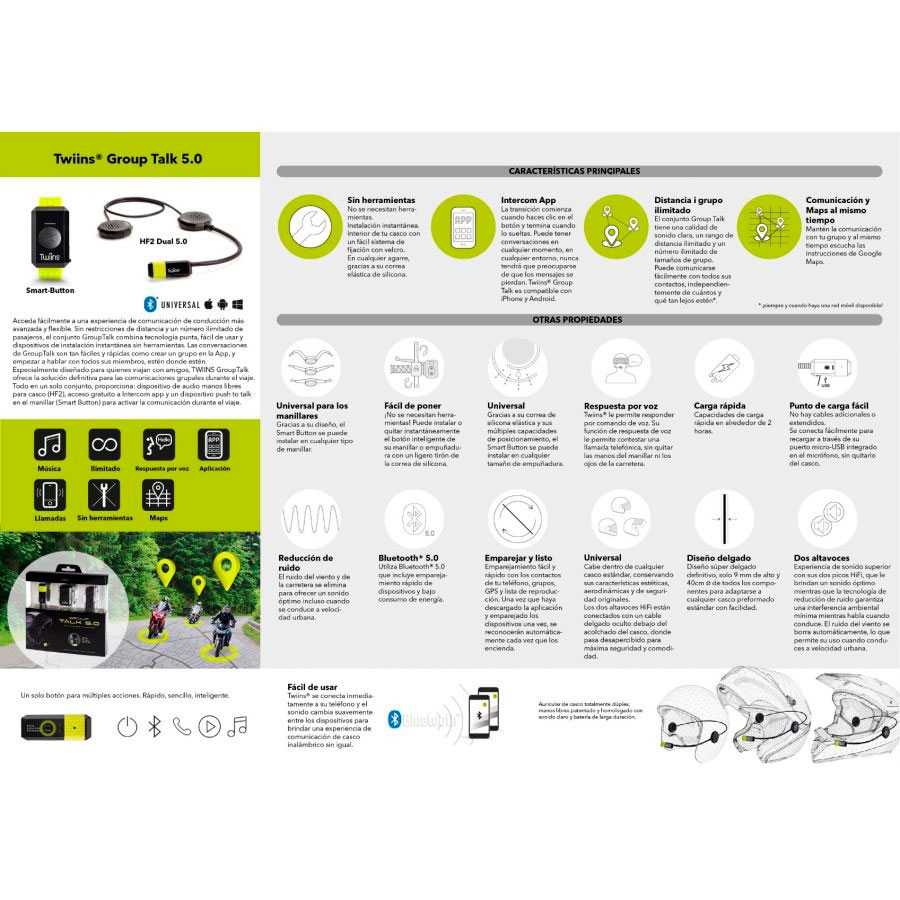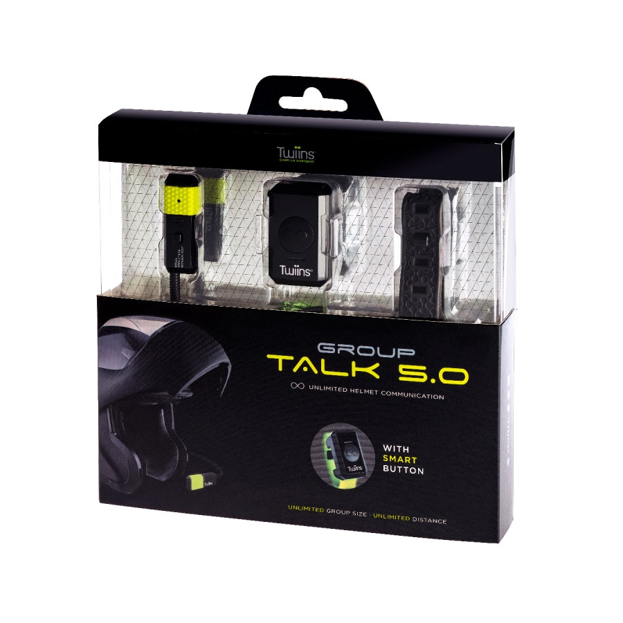 Intercomunicador Twiins Group Talk 5.0. El intercomunicador Twiins Group Talk 5.0 bluetooth está diseñado para ser totalmente integrado en cualquier tipo de casco de forma sencilla, permite comunicar con otro dispositivo sin restricciones de distancia a través de la App. El Twiins Group Talk se compone de un manos libres Twiins HF2 5.0 y un Smart-Button.