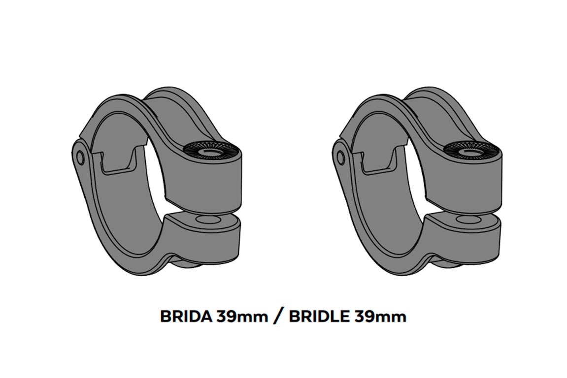 Juego bridas faros auxiliares Puig 20756N. Juego de bridas Puig 20756N de 39 mm y que permiten fijar los faros auxiliar en el protector de motor R19 específico para esta motocicleta. Los faros se adquieren por separado.