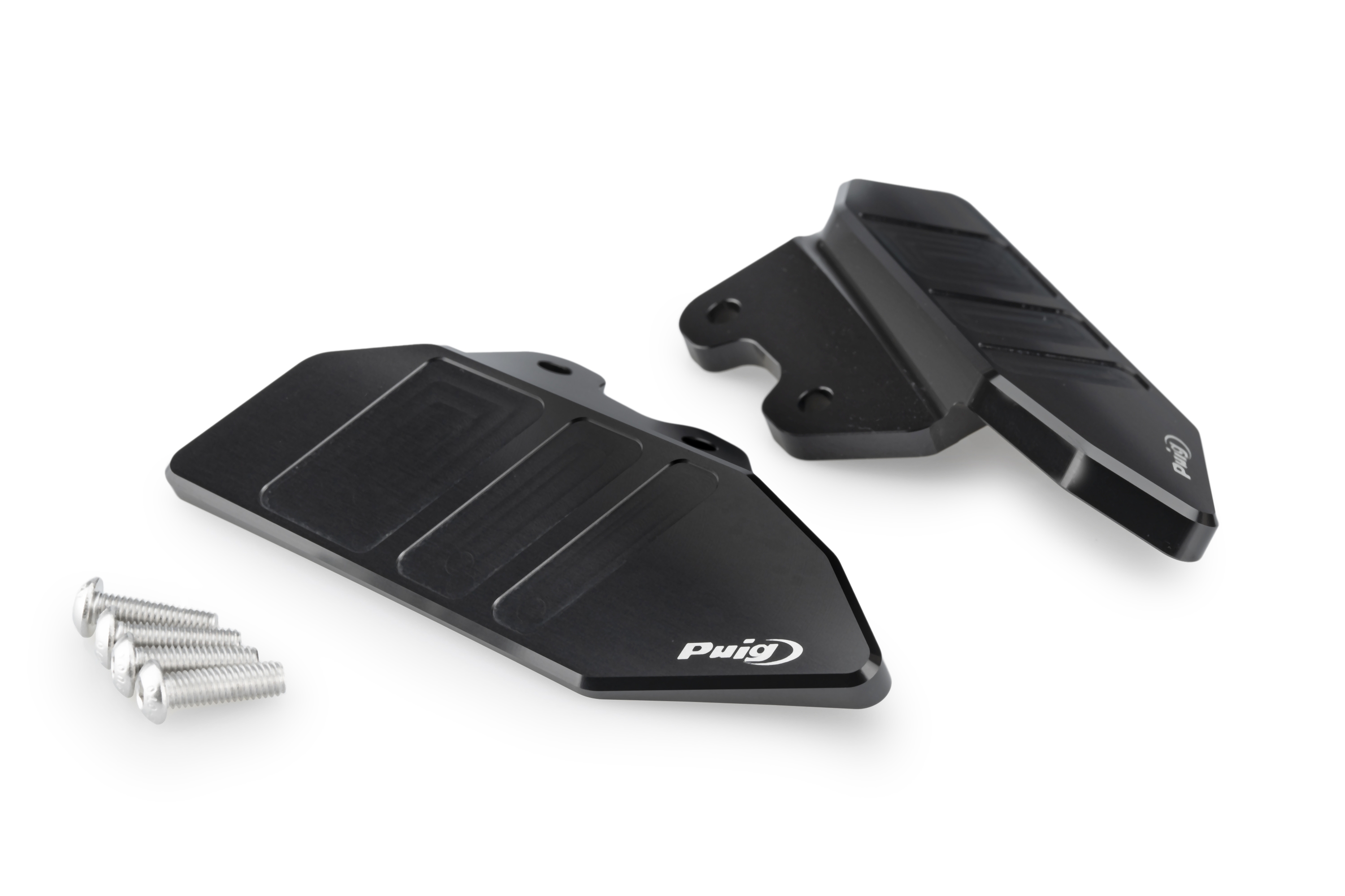 Fabricadas a partir de un bloque sólido de aluminio mecanizado y con acabado anodizado en color negro, combinan resistencia, ligereza y elegancia. Su diseño discreto mantiene la línea estética del carenado sin sobresalir, respetando la forma y la estructura de la moto. Además, el anodizado protege frente a la corrosión y aporta un toque visual premium.