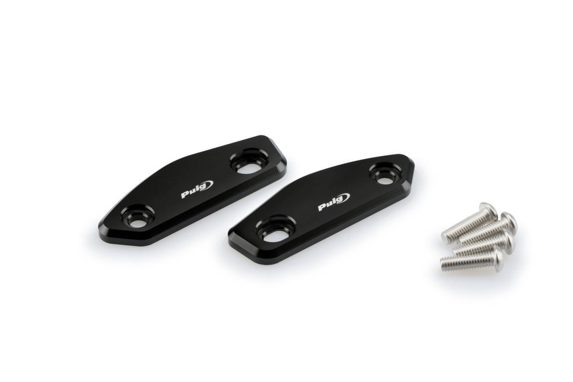 Juego tapitas retrovisor Puig 3851N Suzuki Negro. Las tapas para el retrovisor Puig ofrecen una imagen más limpia además de unos acabados impecables en caso de retirar los espejos para entrar a circuito. Las tapas para el retrovisor Puig están fabricadas a partir de un bloque de aluminio con el posterior anodizado en color negro, un tono que combina con cualquier modelo deportivo. Su diseño está especialmente ideado para no destacar sobre el carenado, manteniendo su forma y funcionalidad estructural. Precio de la pareja. En algunos casos las imágenes mostradas pueden ser orientativas.