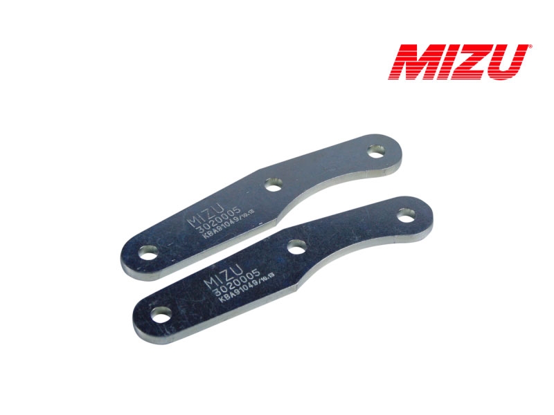 Kit bajar suspensión Mizu 3020005. Kit de suspensión Mizu 3020005 que permite bajar la suspensión. Realizado con materiales de alta calidad, el kit Mizu cuenta con garantía de 3 años. Con los kits de suspensión para moto Mizu podrás bajar o subir la altura de tu moto sin que por ello tengas que modificar la geometría. Diseñados y fabricados en Alemania bajo las directrices de la ISO 9001 y con certificado de homologación europea TÜV. Para garantizar la compatibilidad del kit Mizu es necesario comprobar el Tipo especificado en la ficha técnica.