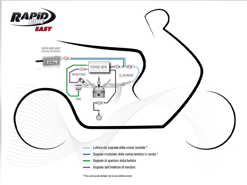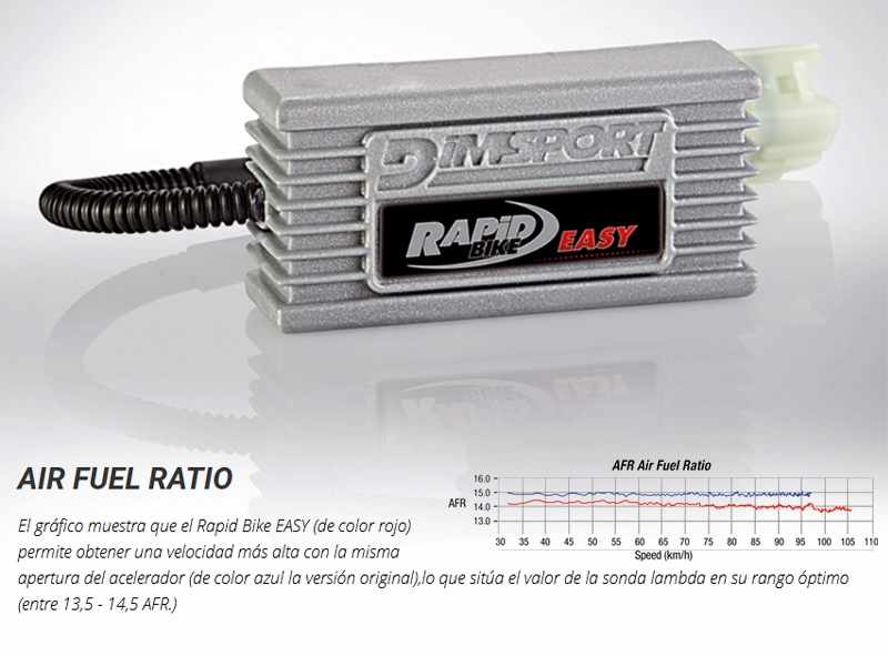 Kit centralita Rapid Bike Easy RBE025. Rapid Bike Easy es un módulo adicional que incluye cableado con conexión Plug & Play específicos para cada modelo de moto. Rapid Bike Easy dispone de un microprocesador que permite modificar directamente la señal de la sonda lambda para una optimización de la relación aire/gasolina. También aporta una mejora en las prestaciones del motor y además, elimina las caídas en la entrega de par, prestando particular atención a los regímenes bajos y medios. Conecta la unidad de control Rapid Bike Easy a los conectores originales de la sonda lambda y verifica su correcto funcionamiento a través de los 2 leds de estado.
