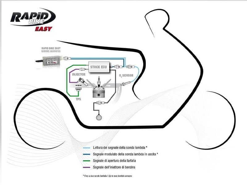 Kit centralita Rapid Bike Easy RBE039. Rapid Bike Easy es un módulo adicional que incluye cableado con conexión Plug & Play específicos para cada modelo de moto. Rapid Bike Easy dispone de un microprocesador que permite modificar directamente la señal de la sonda lambda para una optimización de la relación aire/gasolina. También aporta una mejora en las prestaciones del motor y además, elimina las caídas en la entrega de par, prestando particular atención a los regímenes bajos y medios. Conecta la unidad de control Rapid Bike Easy a los conectores originales de la sonda lambda y verifica su correcto funcionamiento a través de los 2 leds de estado.