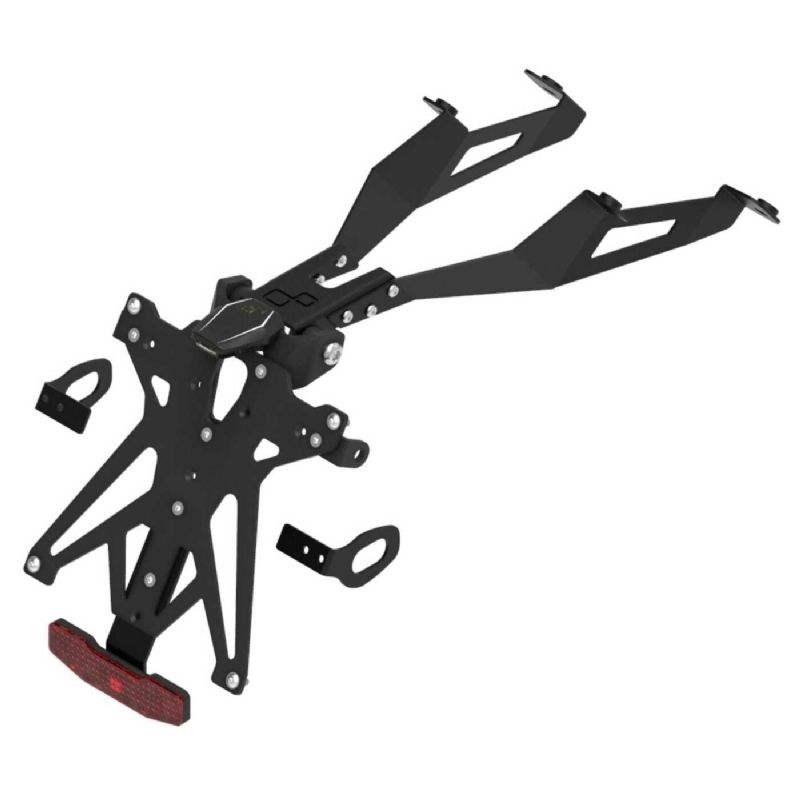 Fabricado en nylon PA12 reforzado con fibra de carbono, el soporte combina ligereza y resistencia, ofreciendo una durabilidad superior al aluminio. Su sistema regulable permite ajustar la inclinación de la matrícula a tu gusto, logrando una línea más limpia y deportiva en la parte trasera de la moto.