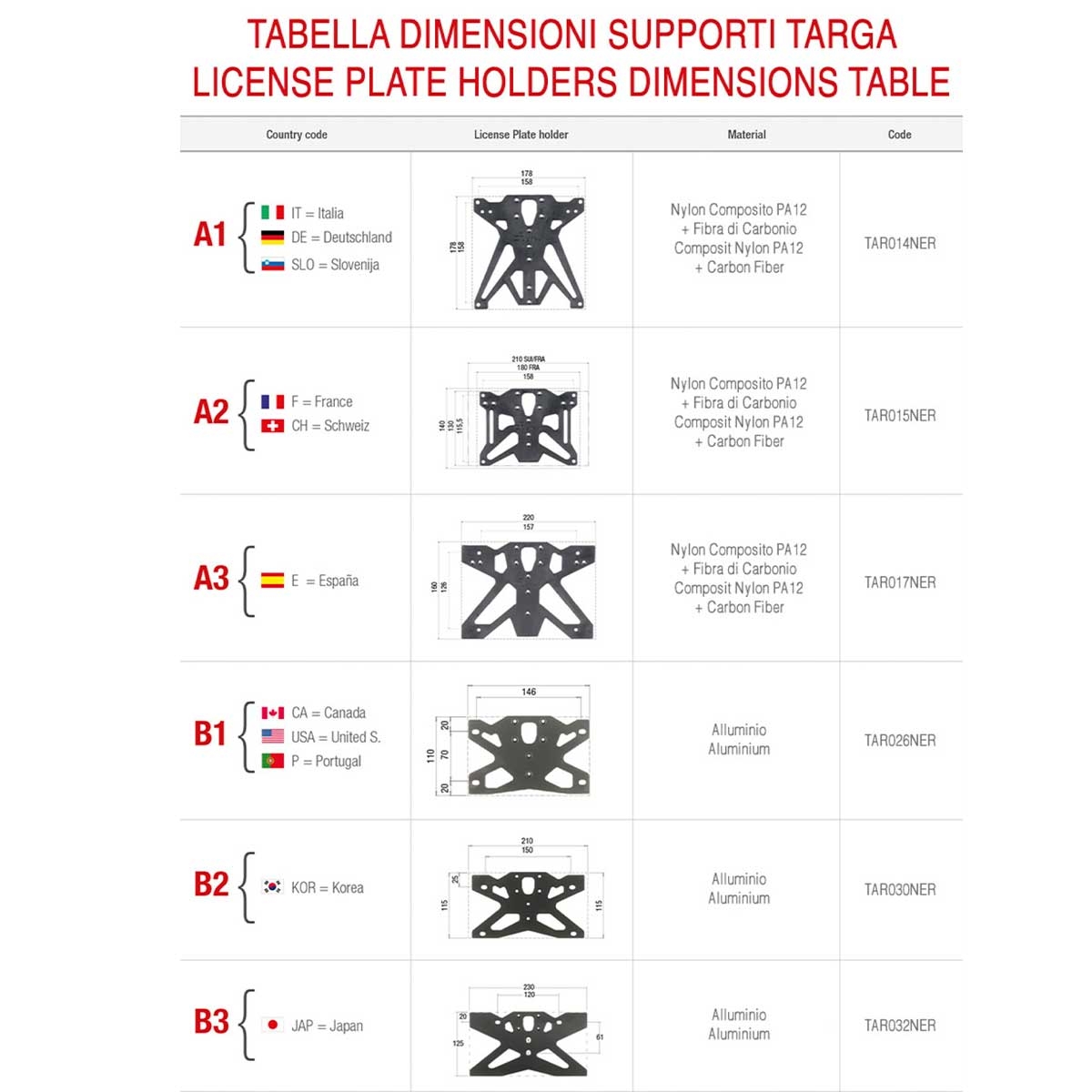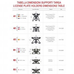Los portamatrículas Lightech se fabrican en distintas versiones porque el tamaño y las proporciones de las matrículas varían de un país a otro. De esta forma, el soporte se ajusta siempre al formato específico de cada mercado: