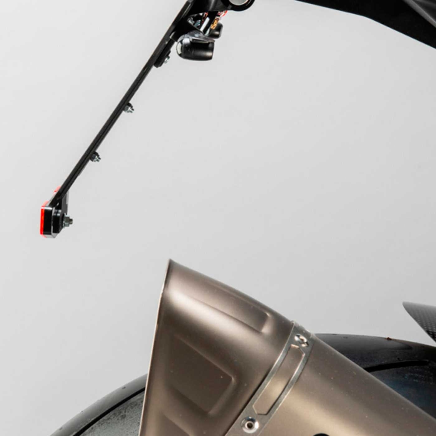 Fabricado en nylon PA12 reforzado con fibra de carbono, el soporte combina ligereza y resistencia, ofreciendo una durabilidad superior al aluminio. Su sistema regulable permite ajustar la inclinación de la matrícula a tu gusto, logrando una línea más limpia y deportiva en la parte trasera de la moto.