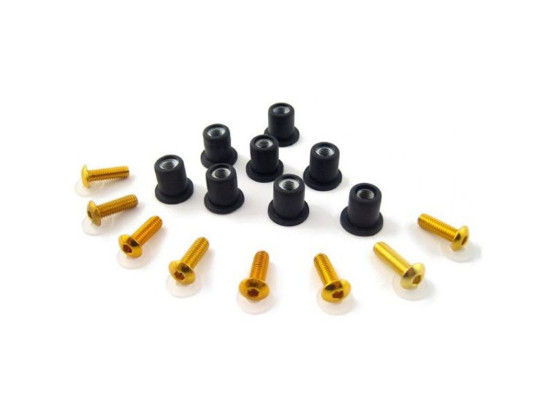 El kit de tornillería anodizada de puig para cúpulas, se compone de 8 tornillos de M5x16, 8 arandelas de plástico y 8 silenblocks negros. Precio kit. Disponible en 7 colores: dorado, azul, lila, negro, plata, rojo y verde.