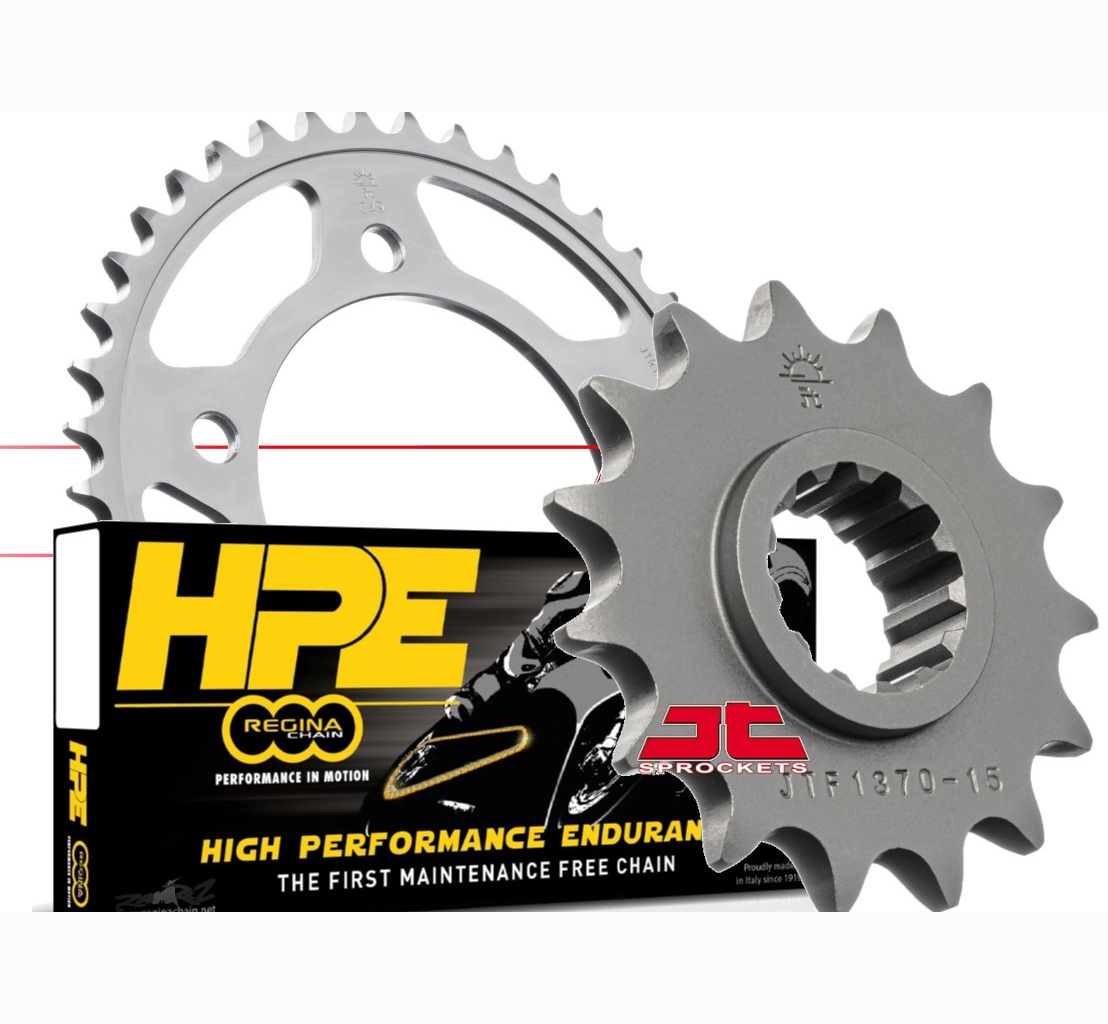 Los kits de arrastre incluyen una cadena Regina de alta calidad junto con una corona y un piñón JT Sprockets, componentes que aseguran una sincronización perfecta y una larga vida útil del sistema de transmisión. La calidad superior de la cadena Regina, conocida por su fiabilidad y durabilidad, se combina con la precisión y resistencia de la corona y el piñón JT Sprockets, fabricados con materiales de alta resistencia.