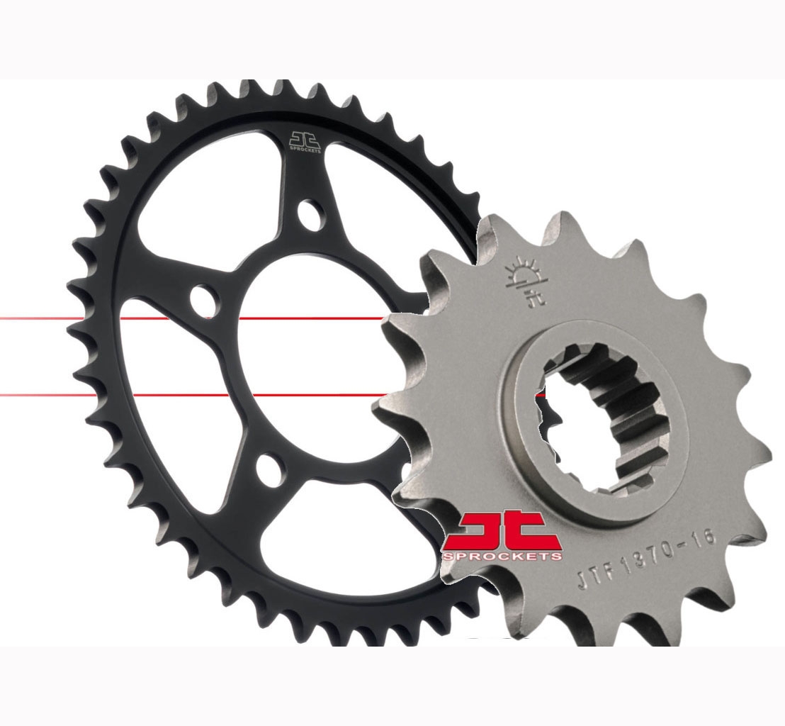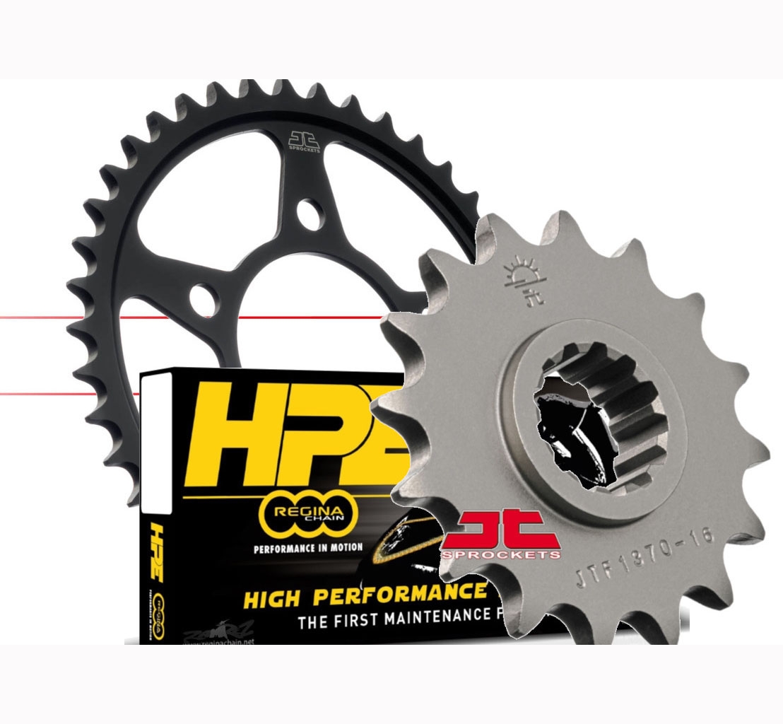 Los kits de arrastre incluyen una cadena Regina de alta calidad junto con una corona y un piñón JT Sprockets, componentes que aseguran una sincronización perfecta y una larga vida útil del sistema de transmisión. La calidad superior de la cadena Regina, conocida por su fiabilidad y durabilidad, se combina con la precisión y resistencia de la corona y el piñón JT Sprockets, fabricados con materiales de alta resistencia.