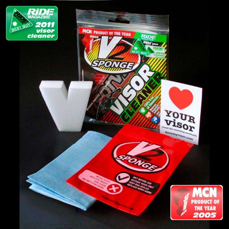 El V2 Sponge es un accesorio esencial de limpieza para motoristas: funciona solo con unas gotas de agua, sin químicos, y elimina eficazmente insectos y suciedad del visor sin dejar marcas.