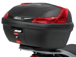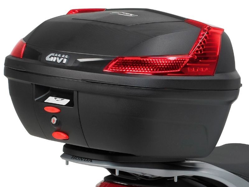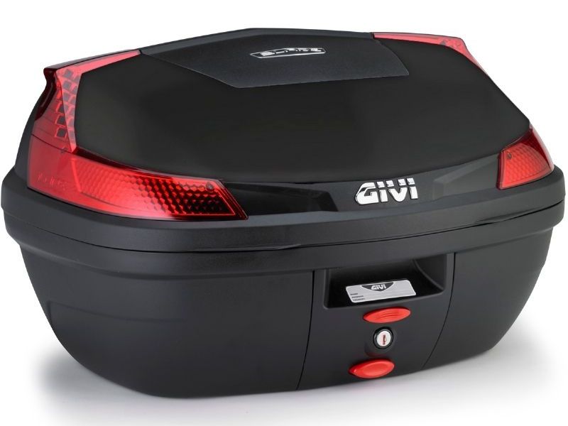 Baúl Givi B47 Blade Monolock B4700NML (no incluye parrilla y kit de fijación universal). La maleta B47 Blade Monolock destaca por ser moderna y de líneas suaves. Gracias a su volumen de 47 litros, permite albergar 2 cascos integrales. Esta versión cuenta con catadriópticos en color rojo. Dimensiones Givi B47: 570 mm (ancho) x 445 mm (profundo) x 340 mm (alto). Carga máxima de 3 kg. Versión negro base.