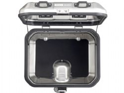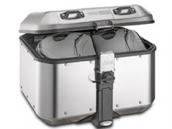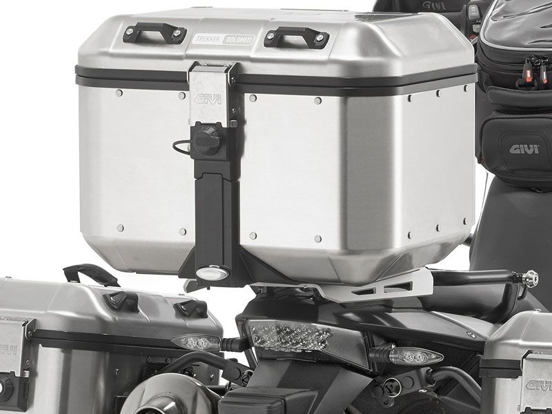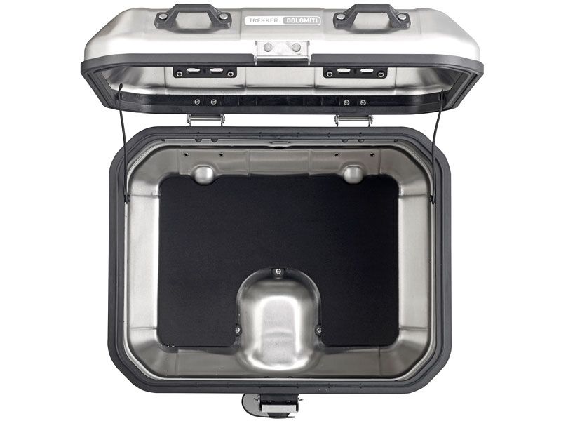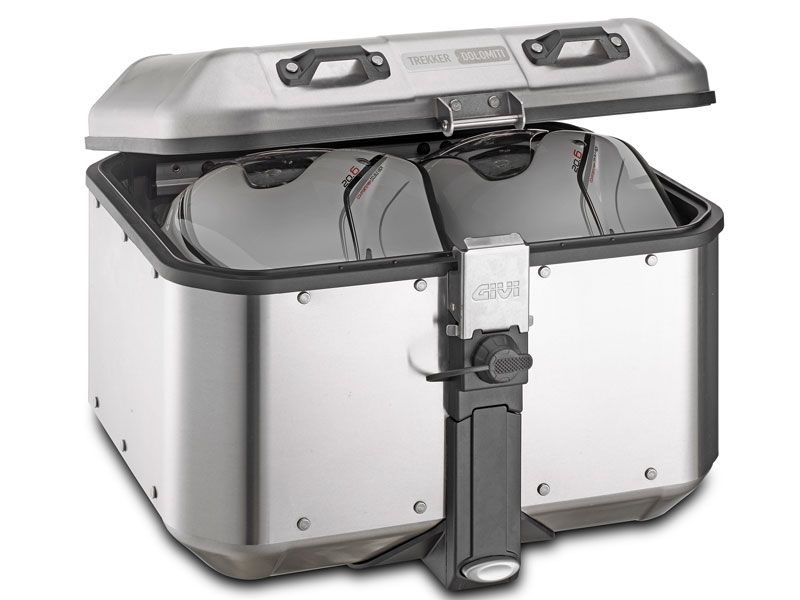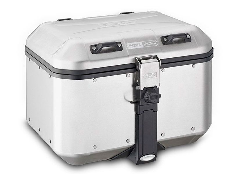 Maleta Givi Trekker Dolomiti DLM46. La nueva maleta central Givi Trekker Dolomiti DLM46 se caracteriza por su diseño elegante y robusto que encaja a la perfección en las motos maxi trail de última generación. Con capacidad de 46 litros, esta maleta puede albergar cómodamente un casco modular o integral o bien dos cascos jet. Realizada en aluminio natural de 1,5 mm, combina fibra de vidrio y materiales plásticos de alta calidad para ofrecer ligereza y resistencia. Además posee una tapa con el fondo remachado en acero inox que le proporcionan excelente rigidez. Las cuatro abrazaderas de nylon sobre la tapa permiten la fijación de una bolsa con las correas Trekker Straps de Givi. Esta maleta es compatible con todos los kits de fijación con sistema de anclaje Monokey disponibles para la mayoría de modelo de motos. El cierre Security Lock con tapón guadapolvo de serie permiten una apertura fácil y precisa, mientras que las gomas de alta calidad en el marco garantizan un cierre perfectamente sellado. El interior cuenta con una espuma acolchada. La maleta Givi Trekker Dolomiti dispone de una serie de accesorios opcionales que aumenta su funcionalidad. Carga máxima de 10 kilos. Medidas: 460 x 410 x 340 mm (Ancho x Profundo x Alto).