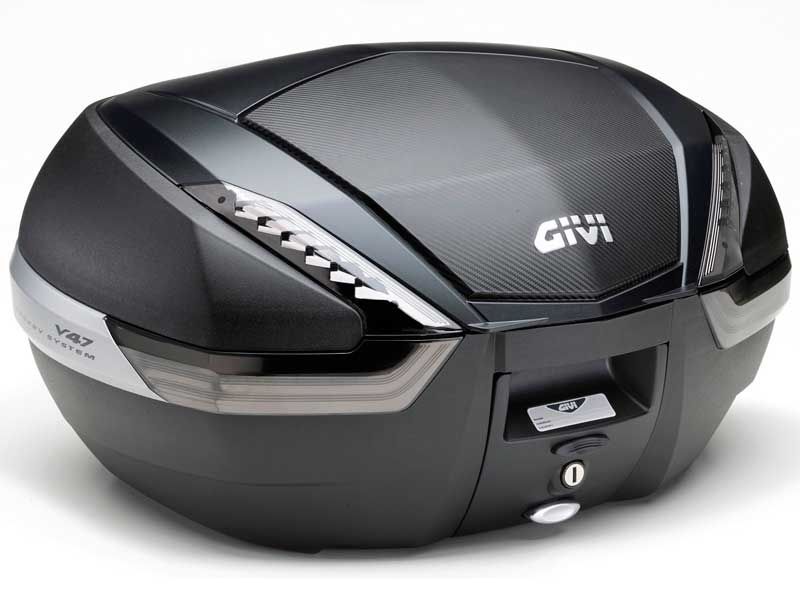 Maleta Givi V47 NNT Tech Monokey. Su diseño moderno con acabado en textura de carbono y catadriópticos ahumados, caracterizan a esta maleta Monokey de nueva generación. Cuenta con un novedoso sistema de cierre que permite cerrar la tapa superior con solo hacer una leve presión. Incluye nuevo sistema de gomas junto con la nueva cerradura Securtity Lock. Permite la instalación de la doble luz de freno E135 y posibilidad de abrirla con mando a distancia E132 (accesorios no suministrados). Volumen: 47 litros (2 cascos modulares). Dimensiones: 590 mm (ancho) x 450 mm (profundo) x 320 mm (alto). V47 NNT: Negro Base/N, Catadrióptico Transparente, Tapa Negra.