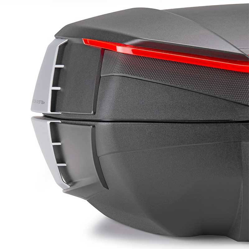 Gracias al exclusivo Wingflow System, desarrollado por Givi tras pruebas exhaustivas en túnel de viento, el baúl V49 AIR V49N reduce vibraciones, disminuye el ruido en marcha, mejora la estabilidad incluso con carga completa y optimiza el flujo del aire alrededor de la moto.