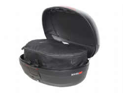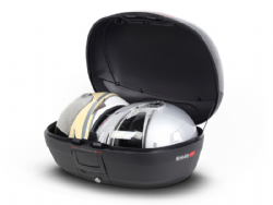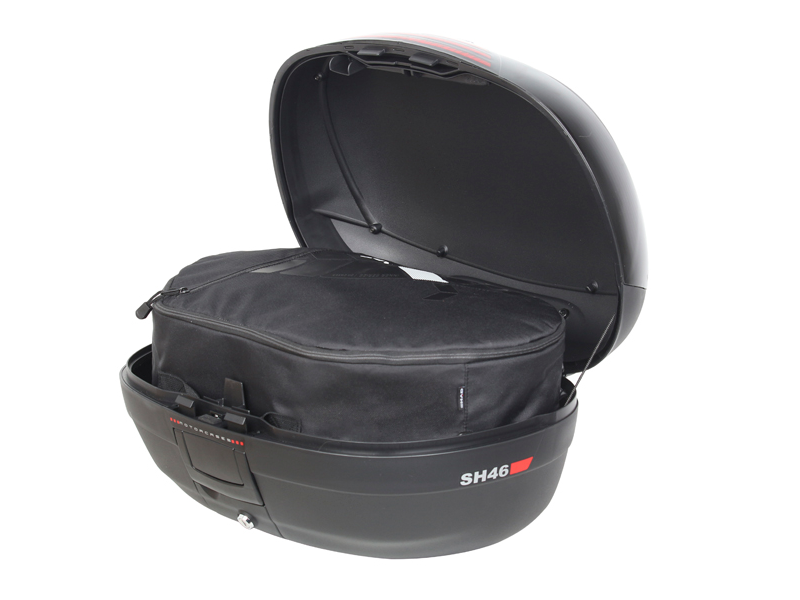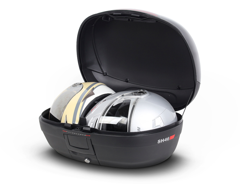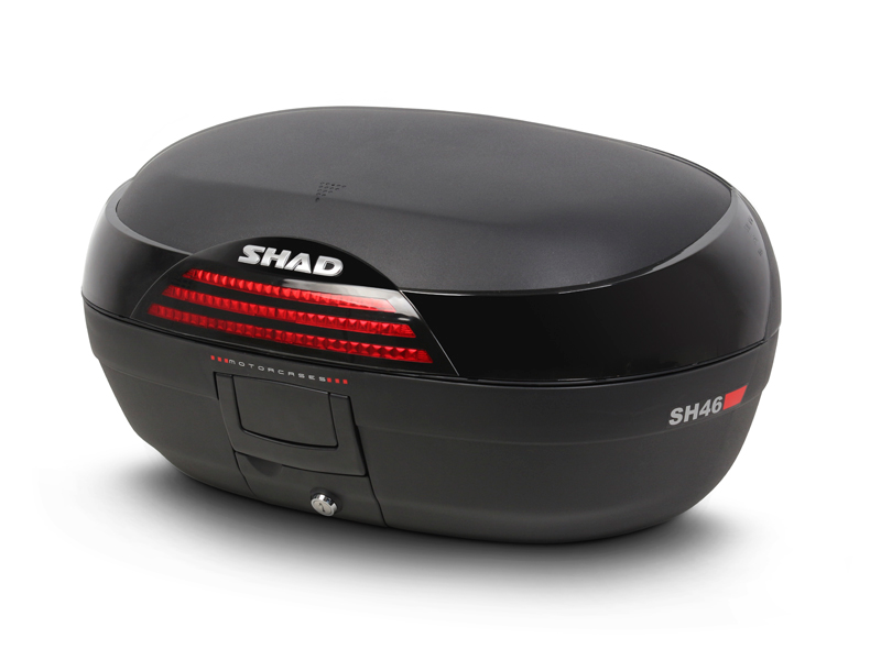 Maleta Shad SH46 Negro D0B46200. La SH46 es sin duda una de las mejores opciones dentro de la gama de maletas Shad. Destacan sus grandes catadriópticos laterales en color blanco que le otorgan una excelente visibilidad. Un nuevo concepto de Topcase preparado para guardar 2 cascos integrales, con Press Lock System y opción de incorporar luz de freno D0B40KL. Posee una amplia gama de colores para combinar con la gran mayoría de motocicletas del mercado. Pletina D1B40PA incluida de serie. Carga máxima autorizada de 6 Kg. Volumen: 46 litros. Dimensiones: 58 cm (ancho) x 31 cm (alto) x 42 cm (profundo).