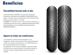 - La franja central posee la mezcla adecuada de sílice y negro-humo para maximizar la estabilidad a altas velocidades y para proporcionar una mayor dispersión del calor además del compromiso perfecto entre durabilidad y grip.