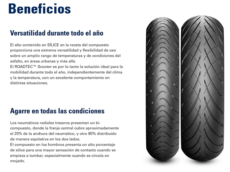 Neumático Metzeler Roadtec Scooter 130/70/16 S61 R 3847000. El neumático Roadtec Scooter es lo último de Metzeler en neumáticos para scooters con llanta de entre 10 y 16 pulgadas. Su diseño está basado en el neumático de moto Roadtec 01 y se caracteriza por ofrecer elevados niveles de versatilidad y flexibilidad en cualquier tipo clima y sobre cualquier carretera. Precio por neumático.