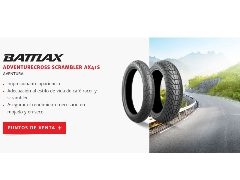 Neumático Bridgestone AX41 Scrambler 110/80/18 H58 F 19885. El nuevo neumático Bridgestone Ax41 Scrambler ha sido diseñado para satisfacer a los amantes de motos café racer. Equipado con las últimas y más modernas tecnologías, el Ax41 Scrambler ofrece un óptimo agarre en carretera seca y también buena seguridad en mojado, gracias al diseño de los surcos del dibujo que facilita el drenaje del agua. Precio por neumático.