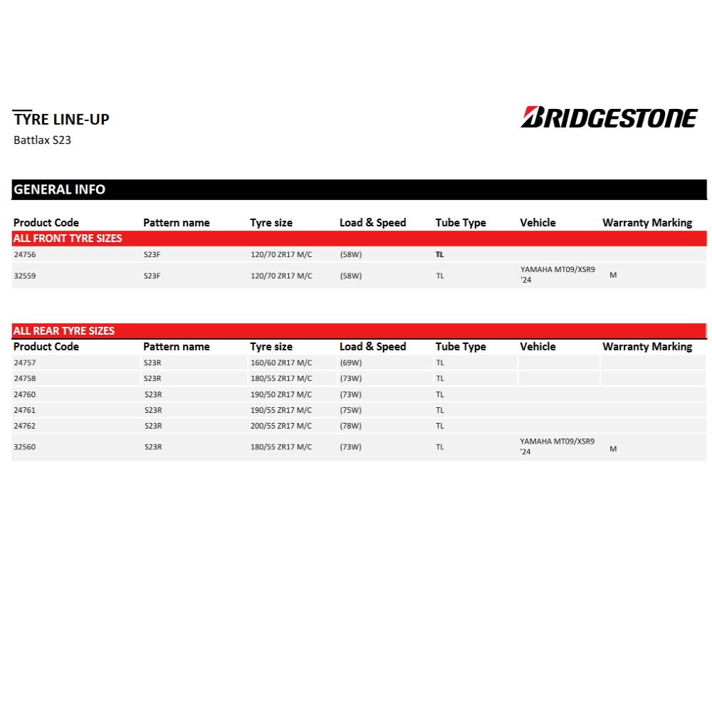 Esta tabla te ofrece una visión clara de las opciones de tamaño disponibles para el neumático Bridgestone Battlax S23, tanto para ruedas delanteras como traseras, incluyendo los códigos de producto y las especificaciones relevantes.