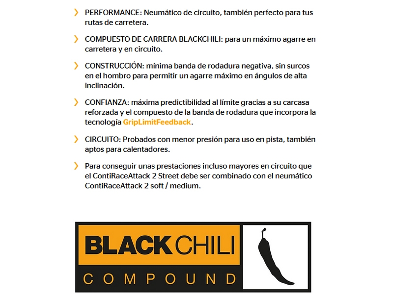 Neumático Continental ContiRaceAttack 2 Street 180/55/17 W73 R 2446590000. Neumático ContiRaceAttack 2 Street Hypersport para uso en circuito y perfecto para conducción deportiva en carretera, gracias a su compuesto BlackChili de última genración. Desarrollado con la mínima banda de rodadura negativa para un agarre excelente en la inclinada. Muy intuitivo gracias a su carcasa reforzada y al compuesto de la banda de rodadura con tecnología GripLimitFeedback. Testado con menor presión para uso en pista. Para conseguir unas prestaciones incluso mayores en circuito que el ContiRaceAttack 2 Street debe ser combinado con el neumático ContiRaceAttack 2 soft / medium. Precio por neumático.