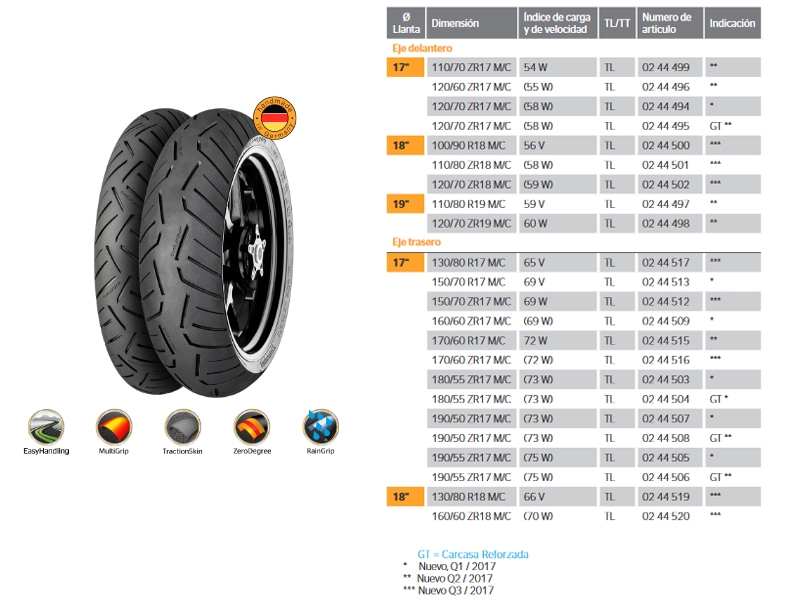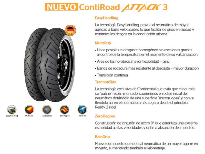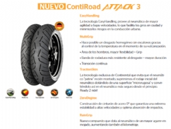 Neumático Continental ContiRoadAttack 3 150/65/18 H69 R. Neumático de moto Continental Contiroadattack 3 diseñado para ofrecer un alto rendimiento en motos touring. Realizado con la tecnología EasyHandling que permite que el neumático sea más ágil a bajas velocidades, haciendo la conducción más fácil en tanto en carretera como en ciudad. Contiroadattack 3 también es especialmente eficaz sobre asfalto mojado, gracias a la optimización de los compuestos y al diseño de dibujo; ofrece mayor grip y capacidad de drenaje sobre lluvia intensa. Otra características muy importante de este neumático touring es, que ofrece un rendimiento muy equilibrado desde el inicio hasta el ultimo kilómetro. Precio por neumático.