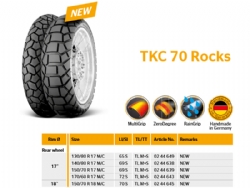 Neumático Continental TKC 70 Rocks 130/80/17 S65 R 2446490000. Continental TKC 70 Rocks es el nuevo neumático para motos trail posicionado entre el neumático TKC 70 y neumático TKC 80. El TKC 70 Rocks es ideal para aquellos usuarios que necesitan mayor agarre y manejabilidad en trayectos off-road y con respecto al neumático TKC 70. Su comportamiento en asfalto también es muy bueno y silencioso, gracias al diseño de espaciado de los tacos. Puede combinarse con el neumático delantero TKC 70 dependiendo de las necesidades de cada motorista. Pecio por neumático.