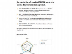 Neumático Continental TKC 70 Rocks 150/70/18 S70 R 2446450000. Continental TKC 70 Rocks es el nuevo neumático para motos trail posicionado entre el neumático TKC 70 y neumático TKC 80. El TKC 70 Rocks es ideal para aquellos usuarios que necesitan mayor agarre y manejabilidad en trayectos off-road y con respecto al neumático TKC 70. Su comportamiento en asfalto también es muy bueno y silencioso, gracias al diseño de espaciado de los tacos. Puede combinarse con el neumático delantero TKC 70 dependiendo de las necesidades de cada motorista. Pecio por neumático.