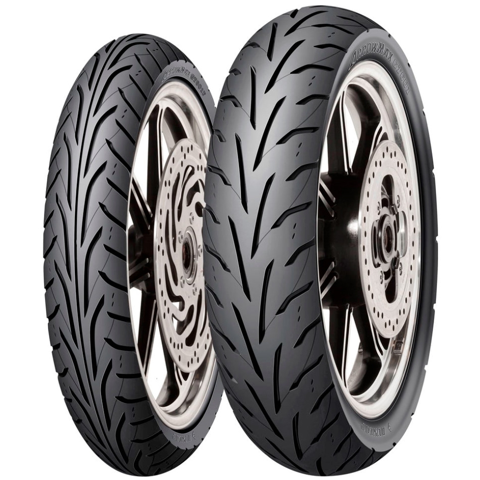 Neumático Dunlop Arrowmax GT601 120/80/18 H62 TL R 636087. Dunlop Arrowmax GT601 es un neumáticos de moto diagonal para uso deportivo y de turismo que se está disponible en una amplia gama de medidas. Está fabricado con un compuesto con una mezcla de sílice que garantiza un alto índice de adherencia y estabilidad en diferentes condiciones de clima y de asfalto. El neumático Arrowmax GT601 combina las conocidas ranuras paralelas y anchas de Dunlop con la utilización de las tecnologías más innovadoras. El resultado es un neumático que ofrece una manejabilidad intuitiva y fluida con una excelente respuesta en la máxima inclinación.