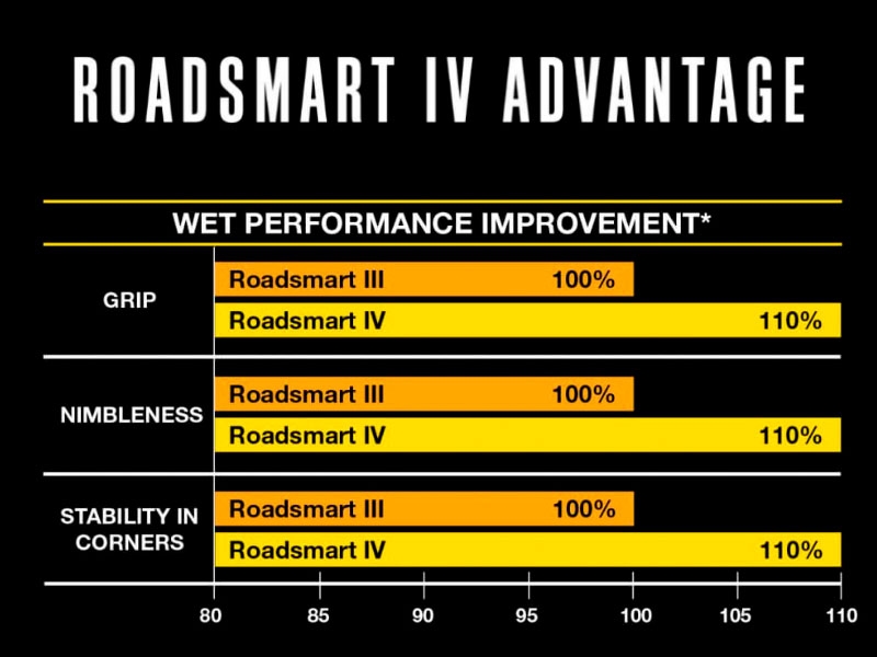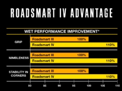 - Rendimiento muy superior sobre asfalto mojado con respecto al Roadsmart III, gracias al nuevo compuesto con un nuevo diseño de patrón optimizado.