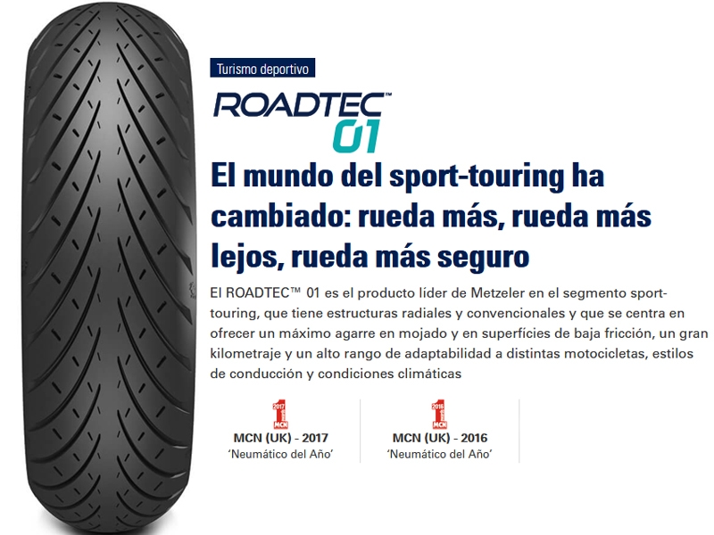Neumático Metzeler Roadtec 01 110/70/17 H54 F 3132400. El nuevo Metzeler Roadtec 01 representa la última evolución de la gama de neumáticos touring Metzeler para moto, siendo el precesor del exitoso Metzeler Z8 Interact. Este neumático se caracteriza por ofrecer mayor durabilidad, mayor agarre en carreteras mojadas y más adaptabilidad a diferentes estilos de conducción y tipos de motocicletas. El Roadtec 01 cuenta ahora con un dibujo de gradiente transversal que garantiza una mayor y más corta área de contacto sobre el asfalto. Gracias a la tecnología Interact y una puesta a punto más precisa de los elementos estructurales, el comportamiento del neumático Metzeler Roadtec 01 es excelente en todos los sentidos. Precio por neumático.