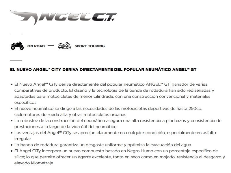 Neumático Pirelli Angel City 80/100/17 S46 2580700. El Nuevo Angel City está especialmente diseñado para motos de estilo deportivo de hasta 250cc, ciclomotores de rueda alta y otras motocicletas urbanas. Angel City deriva directamente del exitoso neumático Angel Gt, vencedor en diferentes comparativas de neumático de turismo. El diseño y la tecnología de la banda de rodadura cuentan con un diseño optimizado para este tipo de motos de baja cilindrada, con una construcción convencional y materiales específicos. Su construcción extremadamente robusta proporciona mayor resistencia contra los pinchazos y mayor durabilidad. Funcionamientoperfecto especialmente sobre terrenos asfalto irregulares, el neumático Pirelli Angel City cuenta con un compuesto basado en Negro-Humo con un porcentaje específico de sílice para un excelente agarre sobre carretera seca o mojada. Precio por neumático.