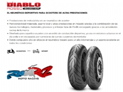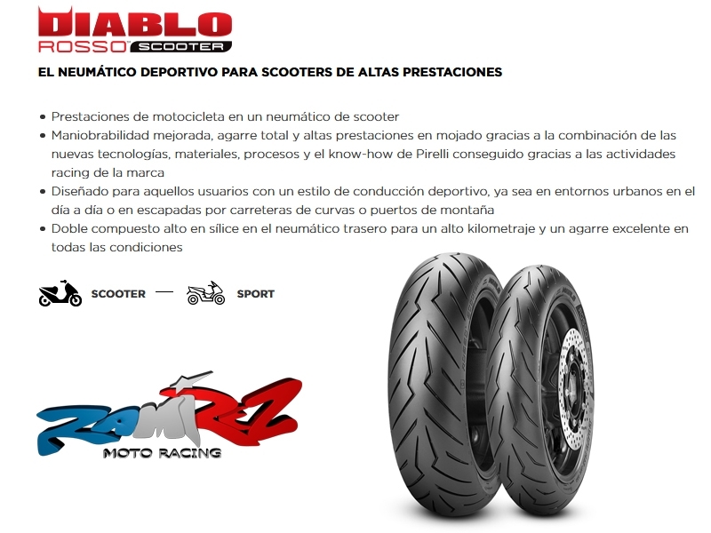 Neumático Pirelli Diablo Rosso Scooter 100/90/10 J56 F/R 3995100. Pirelli Diablo Rosso Scooter es el neumático destinado a los scooters de gama alta y que se comporta excelente por ciudad y tramos de carretera rápidos y semi-rápidos como puertos de montaña o curvas. Este neumático cuenta con un carcasa de nylon que permite mayor estabilidad a altas velocidades y una mejor área de contacto sobre el asfalto. Disponible en medidas convencionales y radiales. El neumático Pirelli Diablo Rosso Scooter posee un dibujo de banda de rodadura optimizado que asegura un desgaste uniforme, un kilometraje muy levado y muy buenas presataciones en mojado. Precio por neumático.
